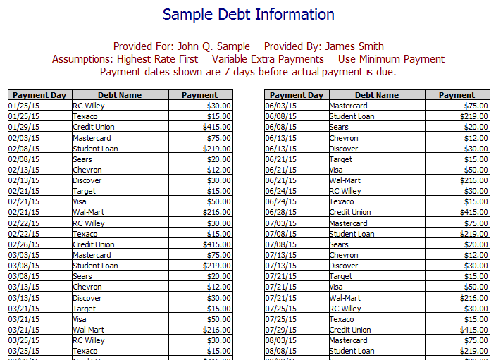The Daily Payment Only Schedule is available only with the Debt Reduction Schedule or Timed Debt Elimination plan. It lists every date that a payment for a debt is to be made, along with the debt and payment amount. If using the Make Payment __ Days Before Payment is Due option from the Reports window, the payments dates listed on the report will reflect this change. A truncated sample report is shown below. This example shows the payment date seven days before the payment is due.