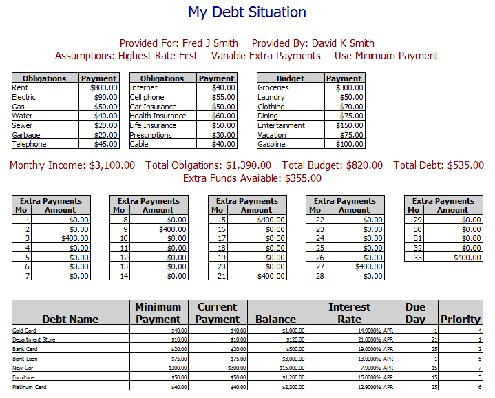 The Debt and Budget Overview Schedule Report is available only with the Debt Reduction Schedule or Timed Debt Elimination plan. It lists all budget items entered in the Set Budget Information window, extra variable payments entered and all debts input. A sample report is shown below.