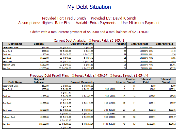 The Debt Elimination Summary Report is available only with the Debt Reduction Schedule or Timed Debt Elimination plan. It lists all current debts, payments, rates, time of payoff, etc. The report also lists the same information based on the new proposed payoff plan. The amount of interest to be saved as well as any reduction in time is displayed. A sample report is shown below.