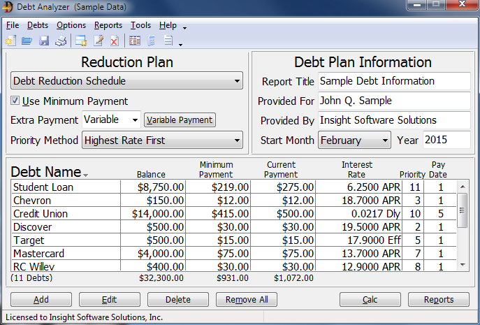 There are three different debt reduction plan types to choose from. These are briefly described below. More detailed information about each of these plans, including the options such as Extra Payment, etc. can be found by clicking on the links to each plan type.