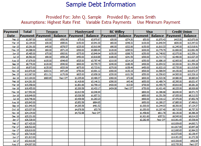 The Payment and Balance Schedule Report is available only with the Debt Reduction Schedule or Timed Debt Elimination plan. It lists each of the debts in a schedule showing what payment should be made for every debt each month. The report also shows the balance on the loan after the payment has been made. Up to five individual debts will displayed on a page. A truncated sample report is shown below.