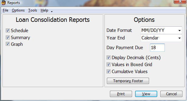 Debt Analyzer window > Select Loan Consolidation > File > Print or click on the Reports button