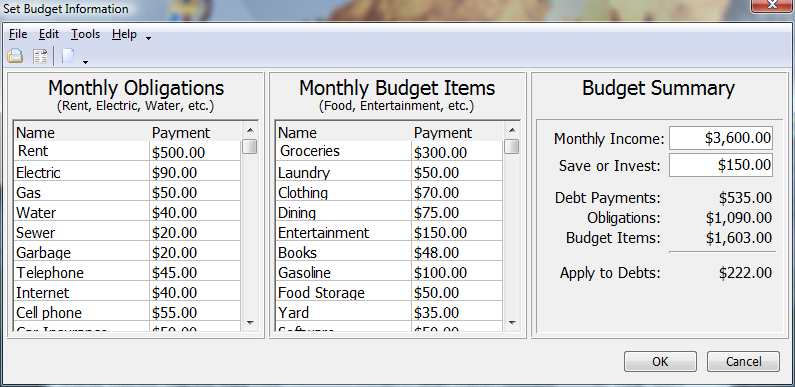 The Set Defaults menu item saves the current set of budget values as default values that can be recalled later. This can be helpful when preparing multiple debt plans for the same person.