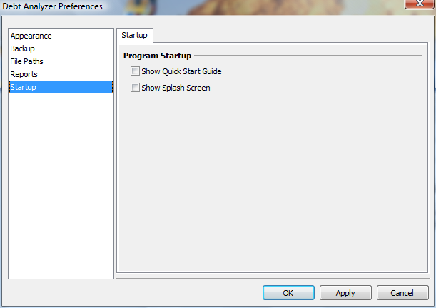 Debt Analyzer > Options > Preferences > Startup