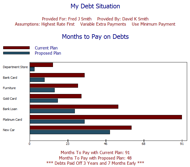 The Time Savings Graph is available only with the Debt Reduction Schedule or Timed Debt Elimination plan. It illustrates how soon the debts can be paid off and the amount of time that can be saved by following the suggested plan instead of simply continuing to make the current loan payments. A sample graph is shown below.