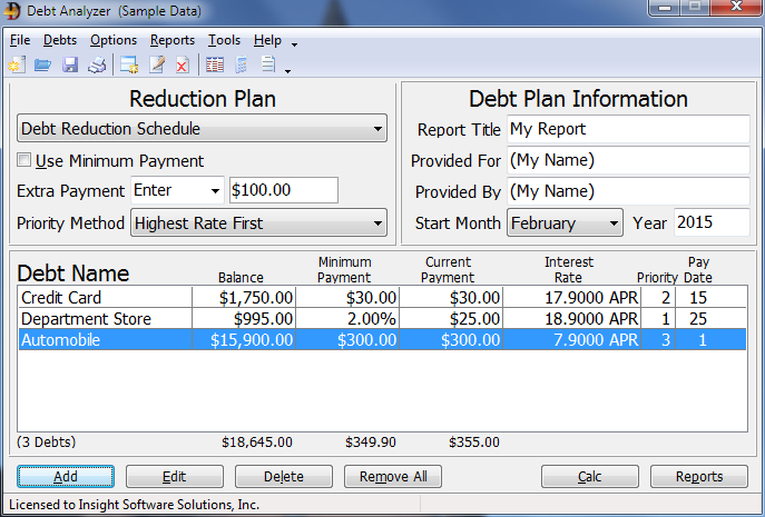 This tutorial steps through the process of entering debt information into Debt Analyzer. For simplicity we will only enter three debts.