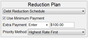 The Minimum Payment option as shown in the image below is only available when using the Debt Reduction Schedule. By selecting this option, Debt Analyzer creates a schedule using the minimum payments for all loans each month. For any debt that has a current payment higher than the minimum payment, Debt Analyzer applies the difference to the highest priority loan.
