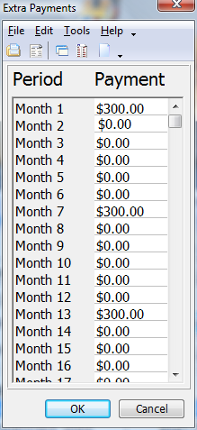 A list of extra payments may be entered for each month in the life of the debt reduction plan, up to 30 years (360 months). The month is listed to the left of the payment amount.