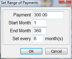 Enter ranges of extra payments by using the Set Range Of Payments window. Choose the starting and ending month as well as the frequency of months to skip.